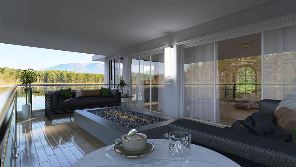 A collection of serene outdoor living spaces featuring ocean and lakeside views, modern lounge seating, fire features, and open-air dining areas. These terraces blend luxury comfort with natural scenery, creating relaxing retreats perfect for entertaining or unwinding.
